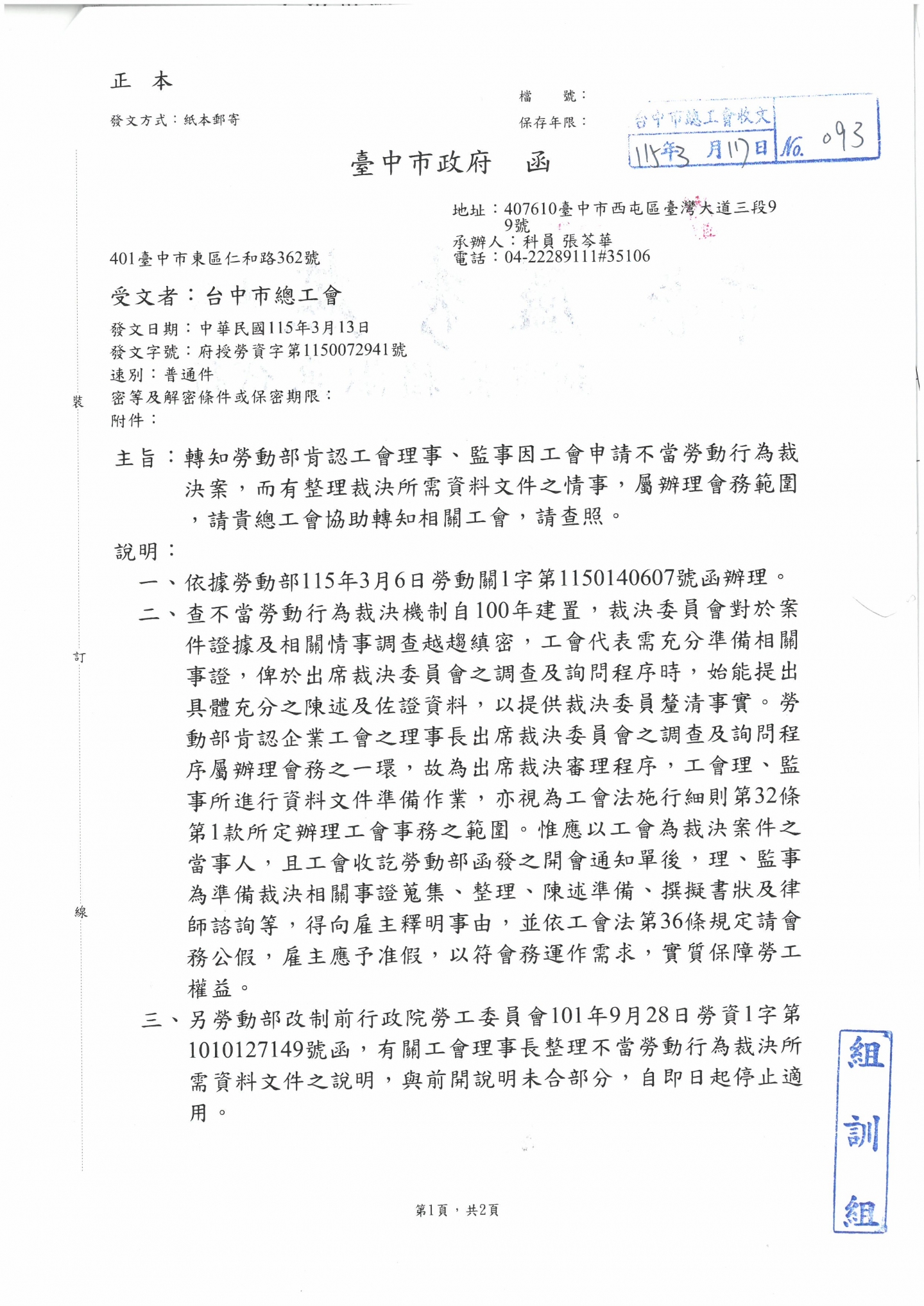 【轉知】勞動部肯認工會理事、監事因工會申請不當勞動行為裁決案,而有整理裁決所需資料文件之情事,屬辦理會務範圍。